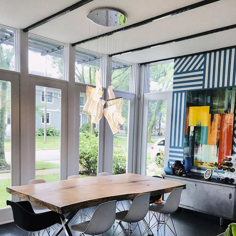 An airy arrangement of abstract forms. the Rinkle pendants feature sheets of transparent acrylic shaped by hand. The light guided acrylic captures the glow of energy efficient LEDs recessed within strips of shining stainless steel. obscuring the source of illumination. Delicately suspended by a series of thin wires. the pendants appear to be floating in an adjustable configuration of weightless light sculpture.