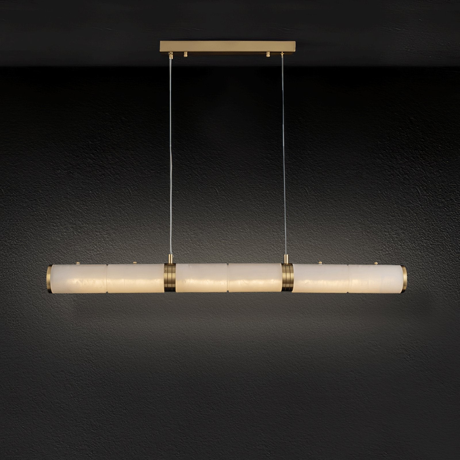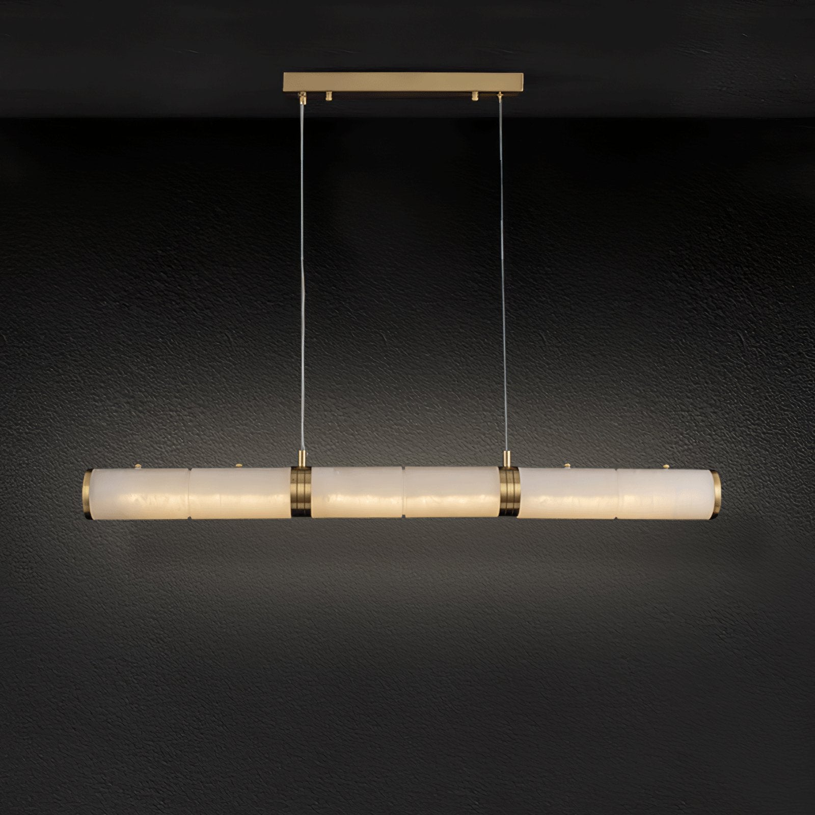 The Alabaster Beam Pendant Light is a sleek and modern lighting solution that exudes sophistication and a timeless appeal. This pendant features a long. cylindrical body crafted from the finest alabaster. a material celebrated for its natural translucence and unique veining patterns.