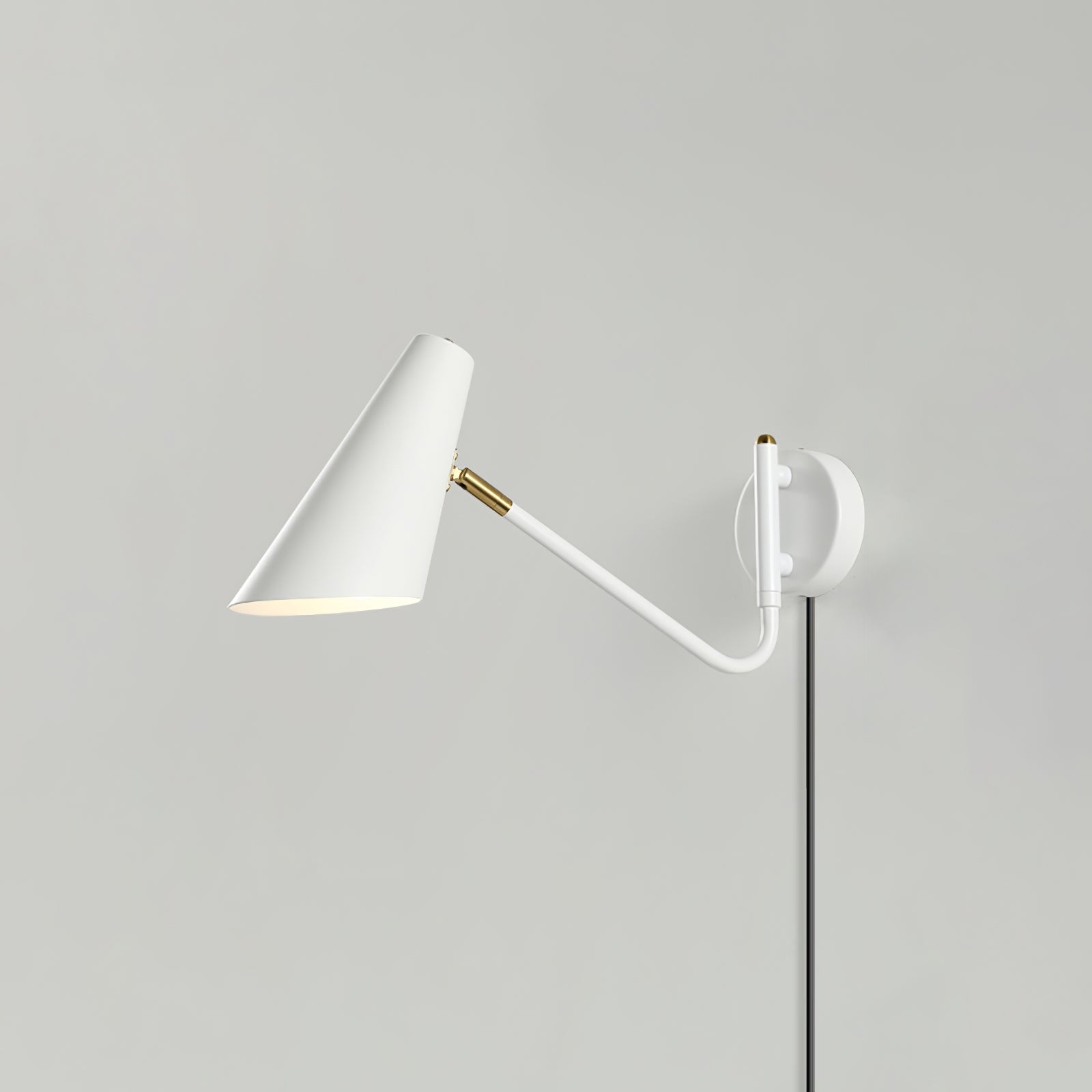 The Apex Plug-in Wall Sconce combines modern minimalism with functional elegance. Its sleek. conical shade and adjustable arm. inspired by mid-century design. provide focused lighting for any space. The contrasting black and brass finish adds a sophisticated touch. making it perfect for contemporary interiors.