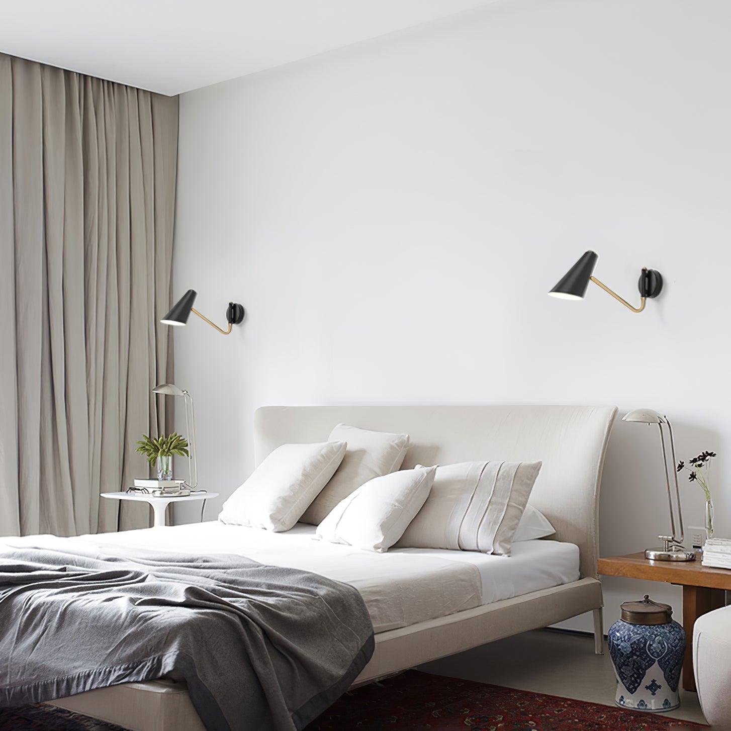 The Apex Wall Sconce combines modern minimalism with functional elegance. Its sleek. conical shade and adjustable arm. inspired by mid-century design. provide focused lighting for any space. The contrasting black and brass finish adds a sophisticated touch. making it perfect for contemporary interiors.