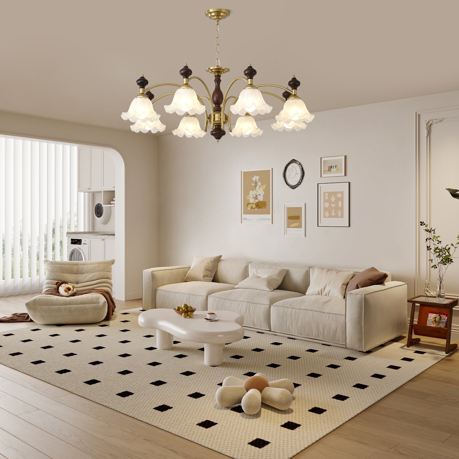 The Ethereal Blossom Chandelier draws inspiration from the delicate petals of blooming flowers. The soft. wavy glass lampshades mimic the gentle curves of a flower's petals. creating an inviting and graceful ambiance. The combination of warm wooden accents and golden metal gives it a timeless elegance that suits both modern and traditional interiors.