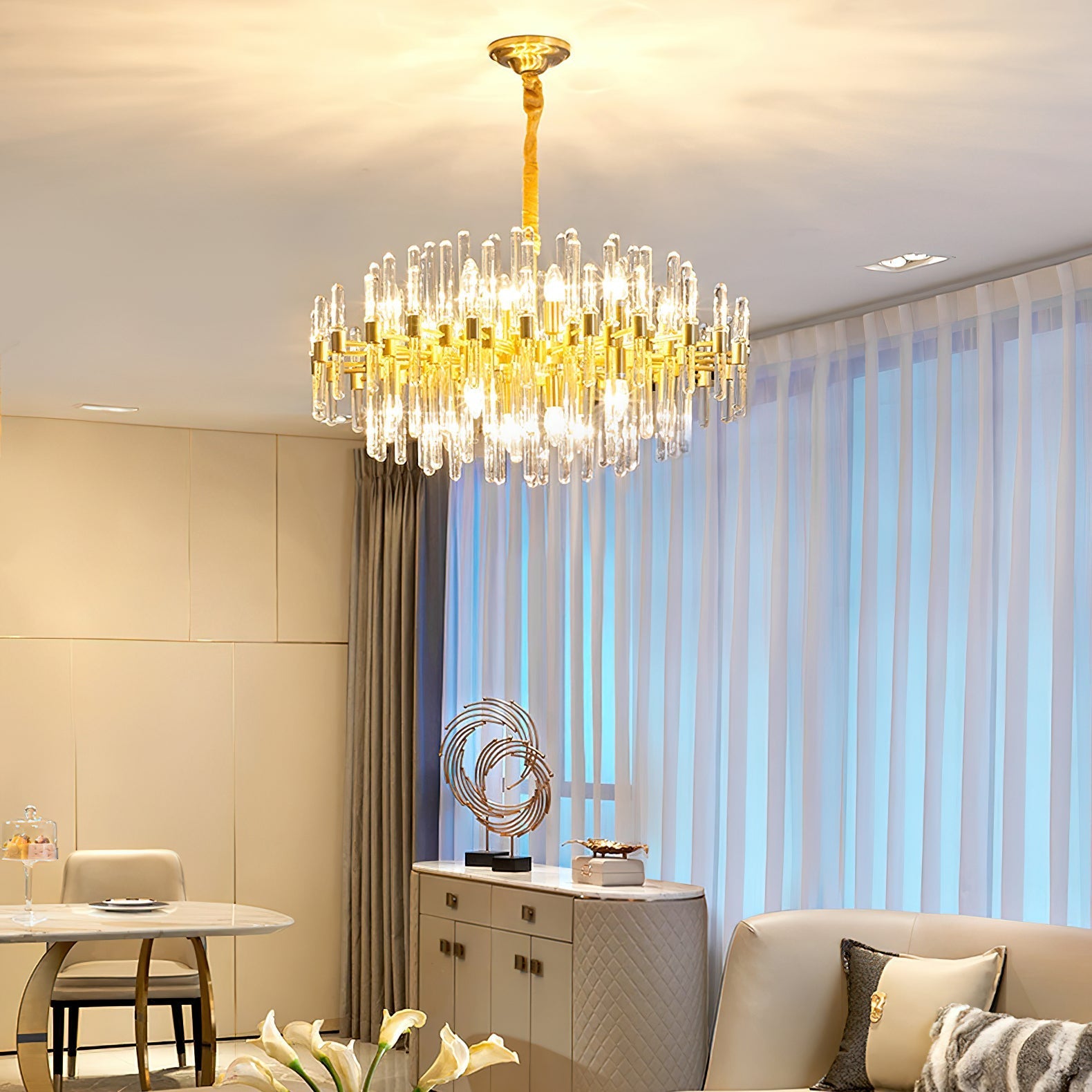 The Antique Brass Chandelier boasts a starburst design that's contemporary and stylish. Made of brass with a vintage-inspired brushed brass finish. and getting its cue from mid-century modern designs. this incredible chandelier is highlighted with clear glass rods that give it a sparkling. spacy effect. perfectly marries the modern elegance of the past with the flair of anew. Finished in a beautifully refined Burnished Antique Brass finish accented by clear glass rods. destined to withstand the ages. Made with solid brass construction to look great.