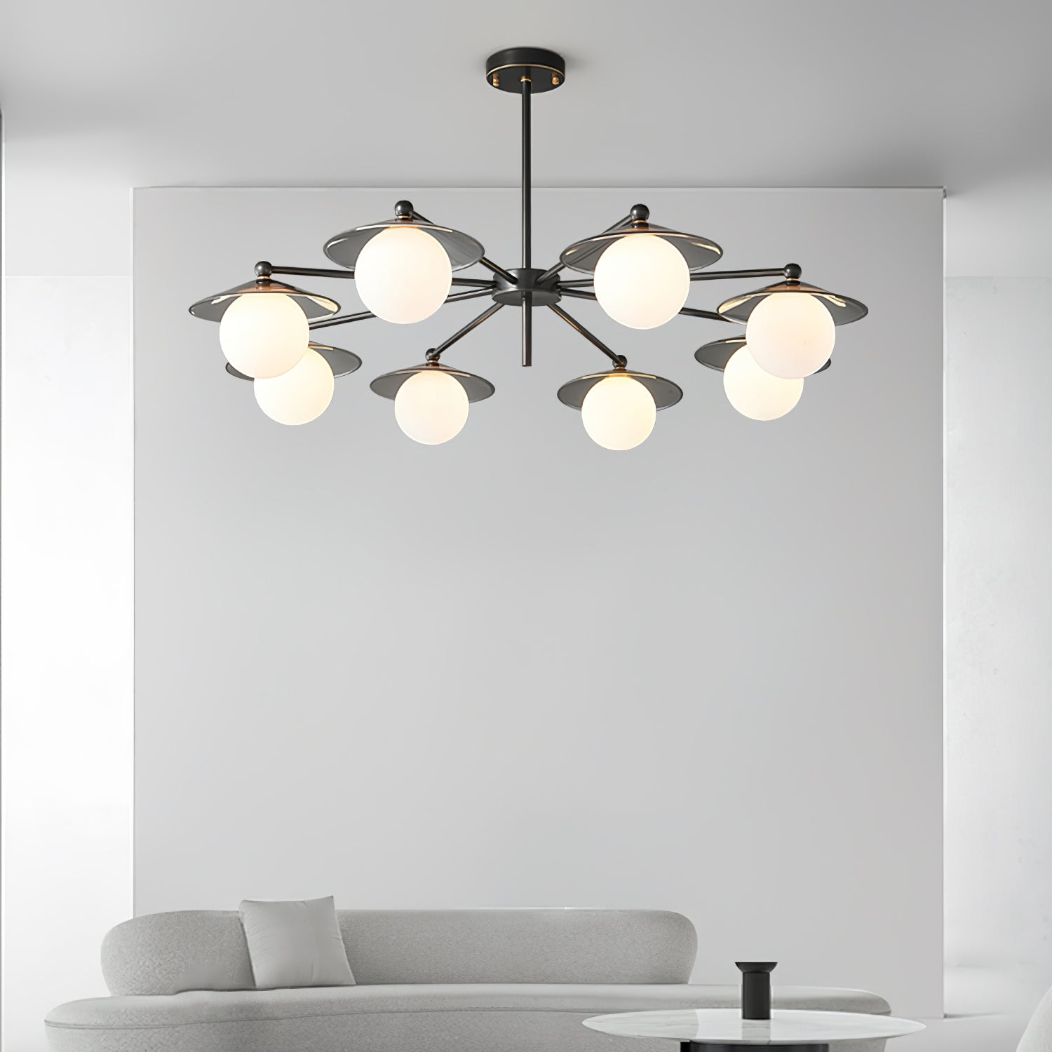 The Celestial Saucer Chandelier presents a captivating interplay of glass and metal. embodying the mystique of a futuristic odyssey. Each orb of glass delicately balances on metallic discs reminiscent of unidentified flying objects gliding through the cosmos. The ensemble of saucer elements forms a harmonious constellation that radiates soft. diffused light. akin to the gentle illumination of a star cluster. This chandelier is not just a source of light; it's a statement piece that encapsulates the spirit of space exploration and the elegance of modern design. Perfect for those looking to infuse their space with a touch of the extraterrestrial. the Celestial Saucer is a true conversation starter that combines functional lighting with avant-garde aesthetics.
