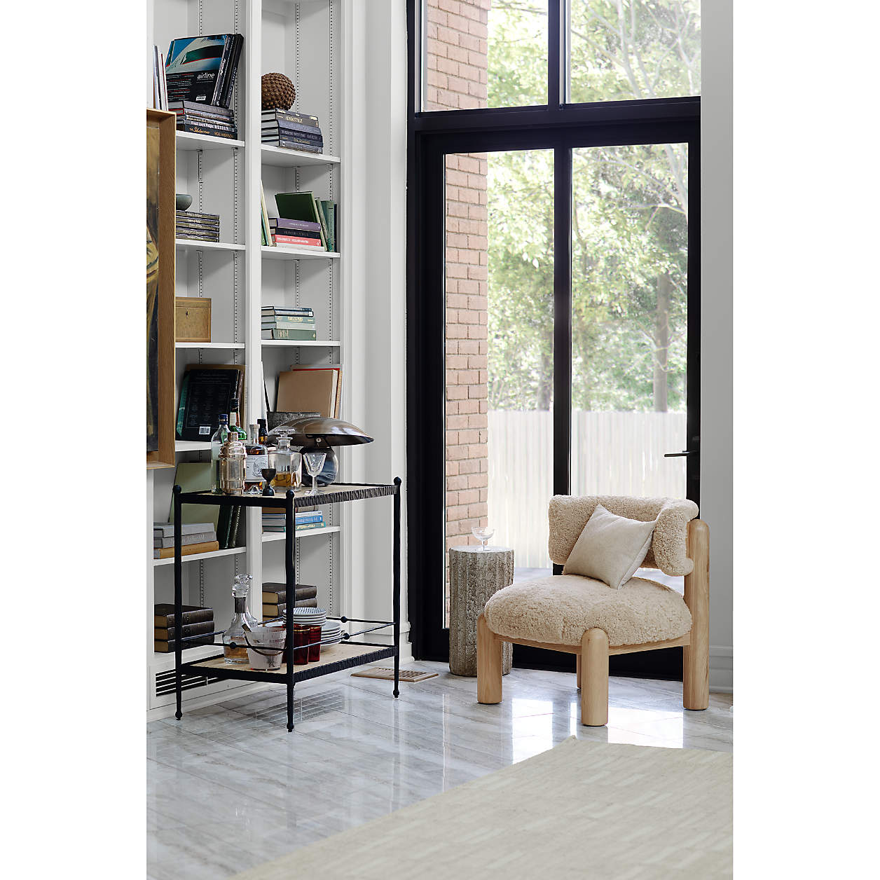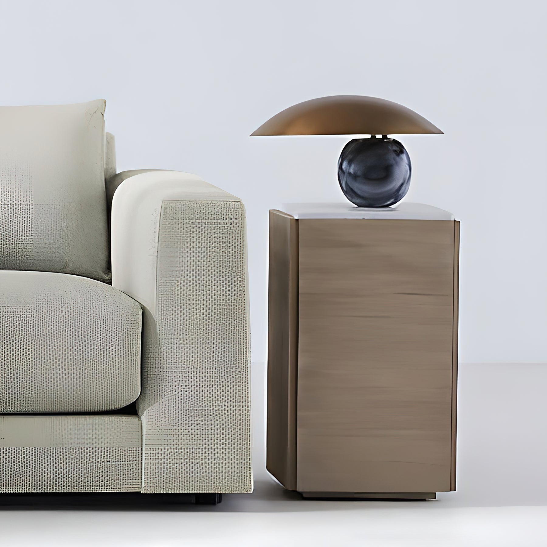 This Formosa Marble Table Lamp features an artistic design. with a polished brass shade floating on a handmade marble base. The dynamic tilt of the shiny metal shade creates a vibrant contrast with the organic swirls of grey. white. and black on the stone sphere. Illuminate your space with this lively and unique lamp.