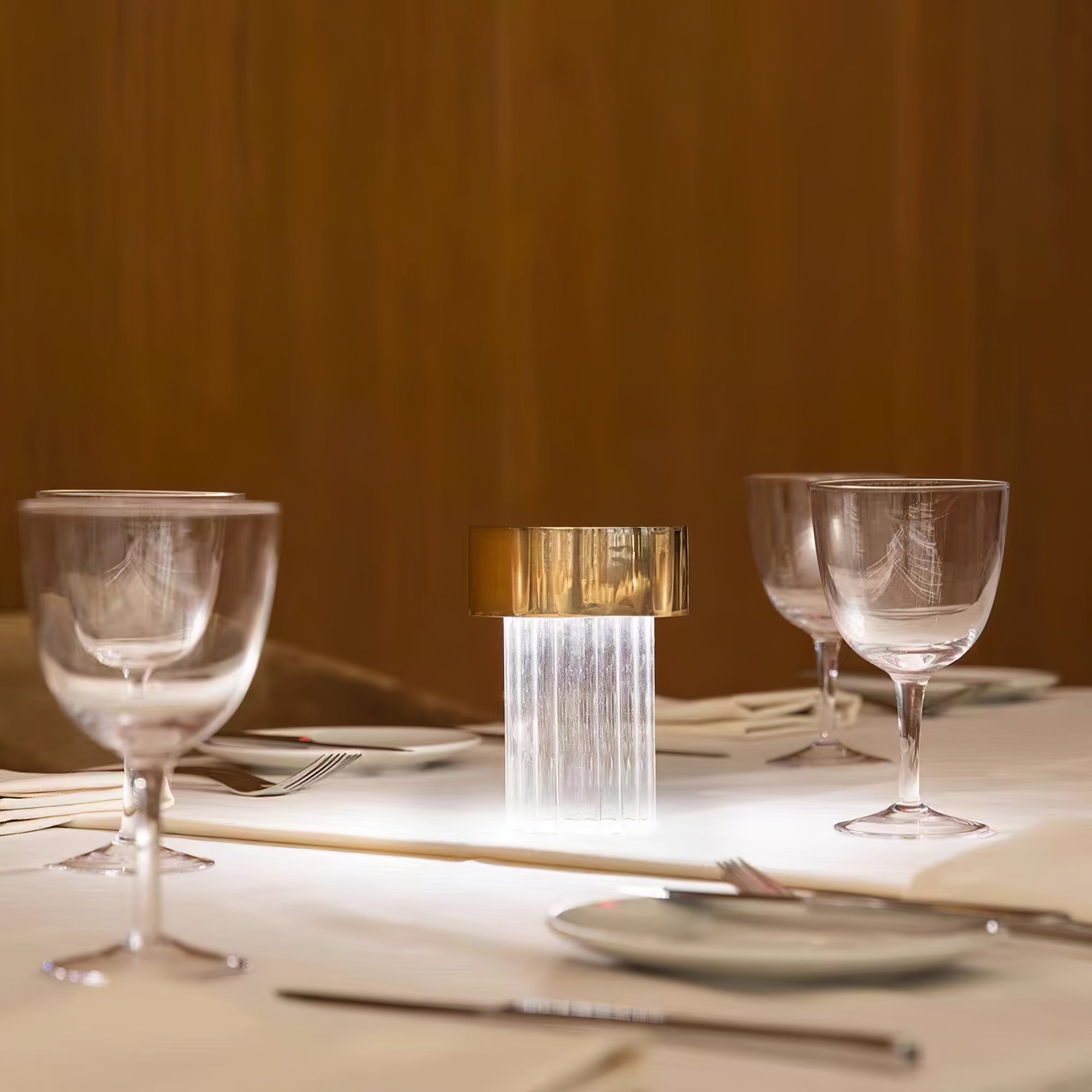 Efficiently illuminate any space with the Last Order Portable Table Lamp by Vakkerlighting. This rechargeable lamp diffuses light through a solid glass base. inspired by ancient columns. The sleek design and long-lasting battery life make it perfect for on-the-go use. Bring elegance and functionality to any room.