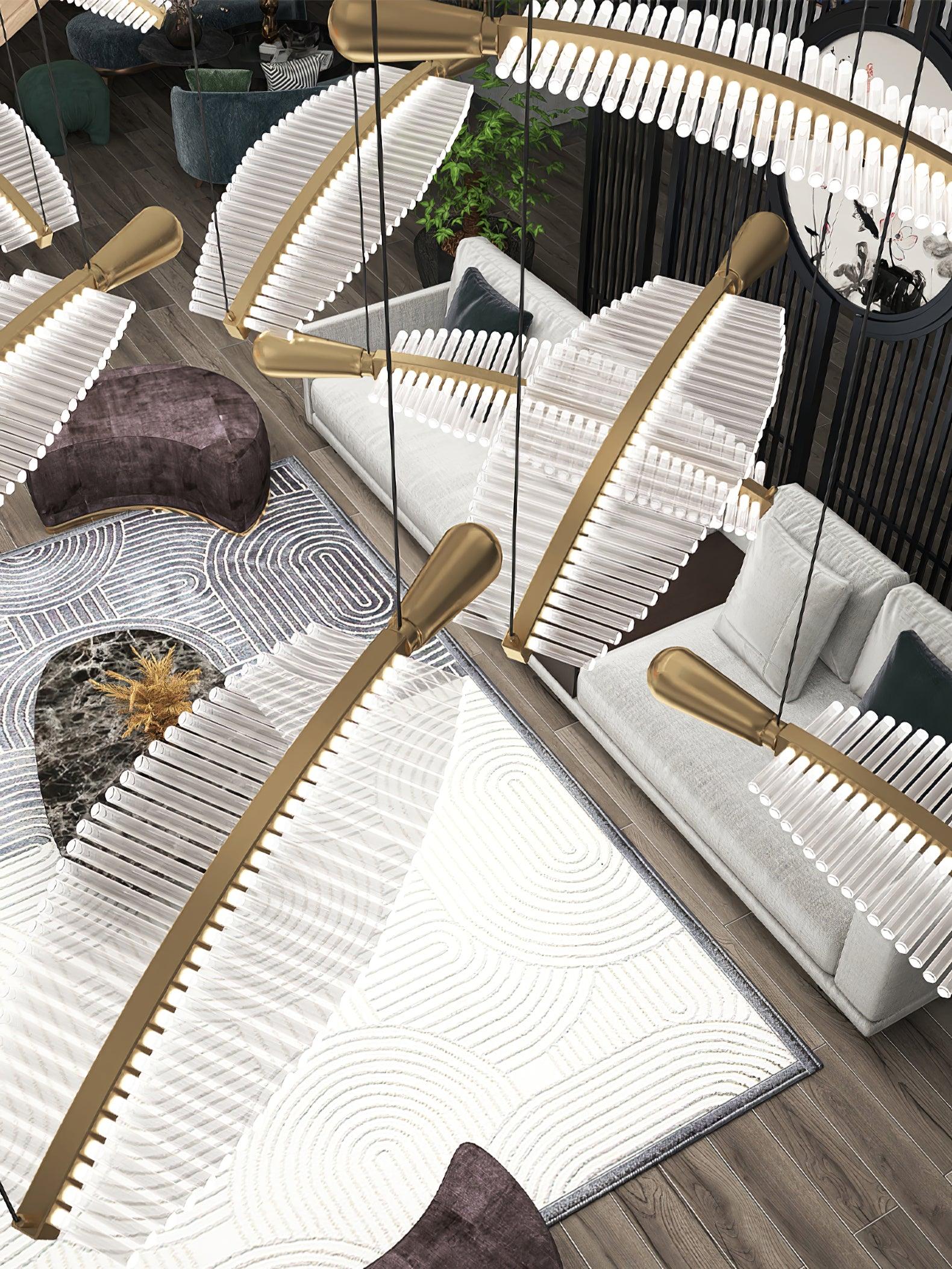 Italian artistry and elegance. embodied. The Leaf LED Chandelier is an expertly handmade display of striking acrylic leaves secured to a powder coated metal frame with Gold finials. As light pours through. every intricate detail is highlighted. creating a luxurious appeal that gorgeously complements the ambient illumination. This chandelier deserves to be placed in a prominent space like a dining room or large foyer.
