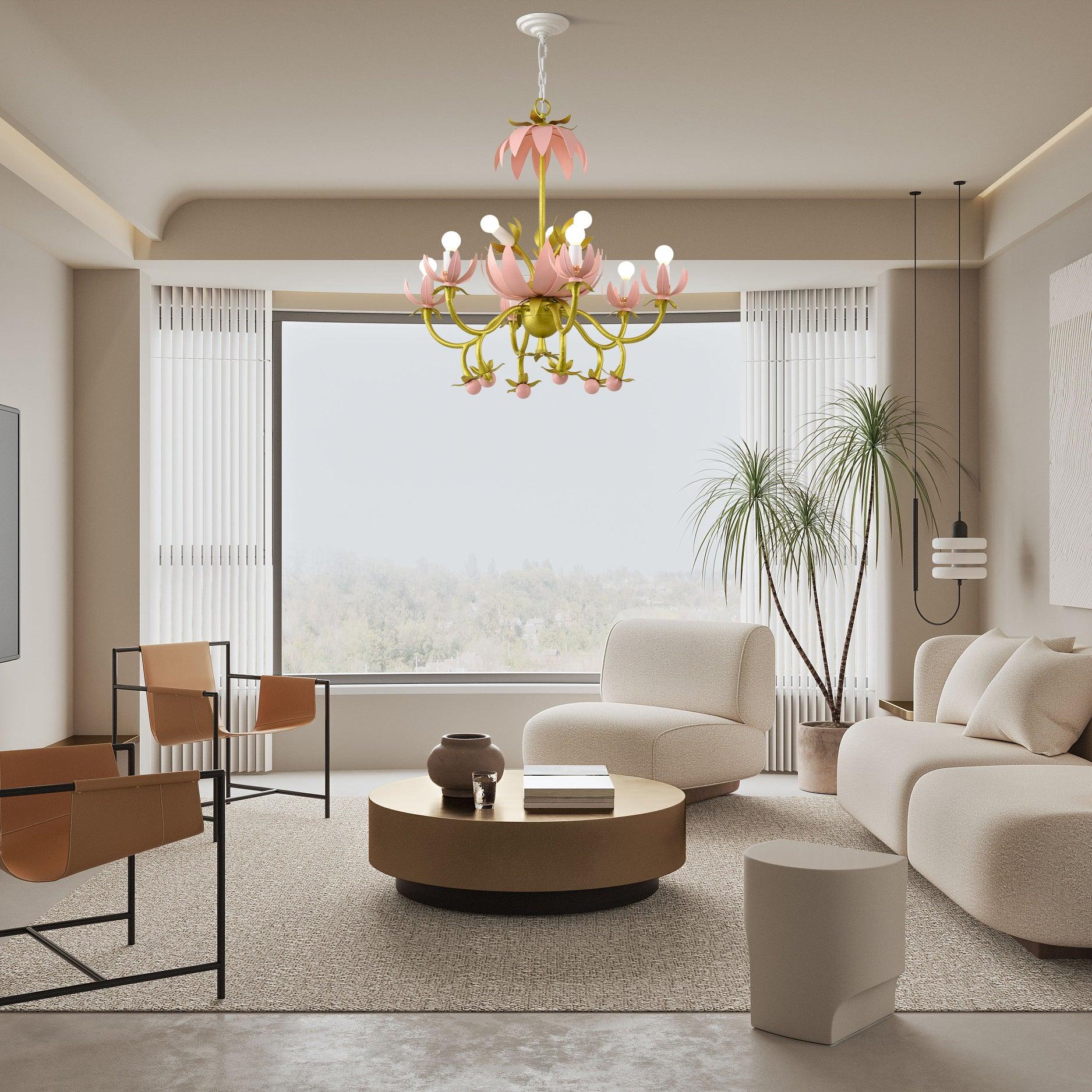 This charming Mardi Gras Blossom Chandelier is a wonderful piece of art. Inspired by the carnival float images from the early 19th century. this captivating interpretation is entirely handmade with a metal framework and layered with hand-prepared papier-mâché to ensure durability. This eye-catching two-tiered chandelier has nine blooming light sources that will provide a glimmering radiance in any room. The rubber eraser-pink hue is complemented by a forest moss stem.
