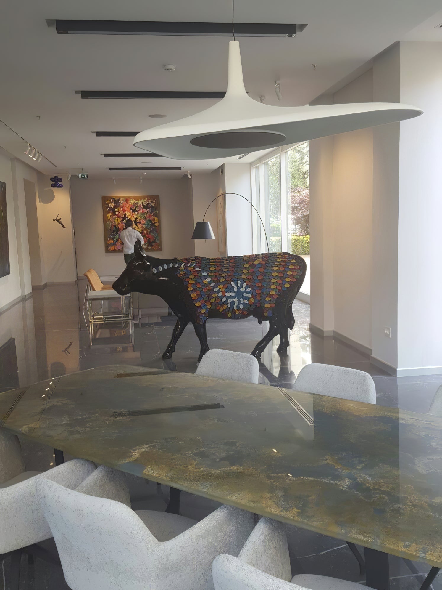 The Soleil Noir Pendant Lamp defies the laws of statics with its slender and aerial design. supported by a single cable. Its body thickness of 8-25 mm ensures barycentric balance. while providing discreet yet elegant lighting. This innovative lamp brings a touch of sophistication to any space.