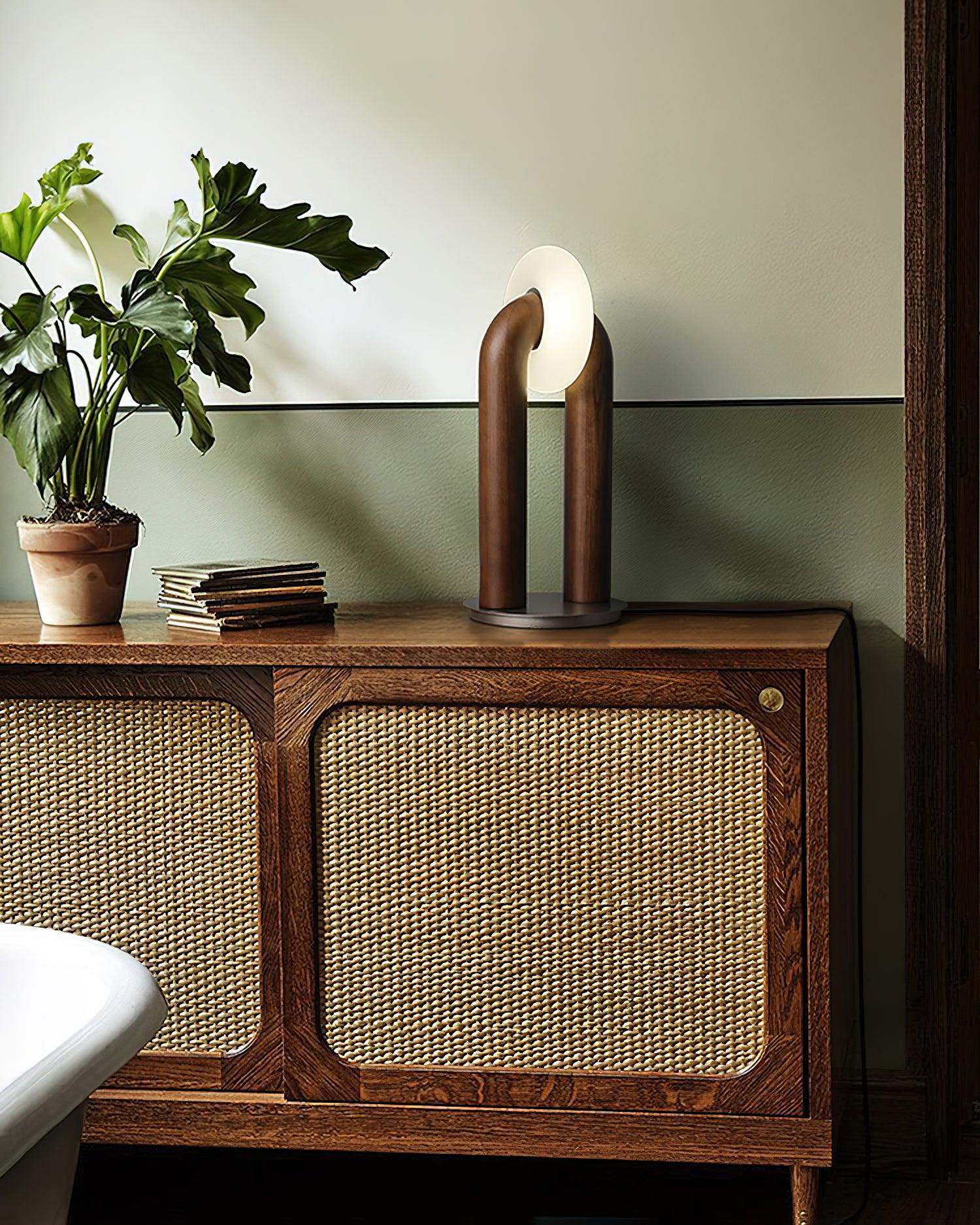 This U-Shaped Xuanguang Table Lamp is both beautiful and practical. It features a Tianmen Xuanguang. an acrylic lampshade. a metal base to enhance load-bearing capacity. and a solid wood lamp body with whole wood carving natural texture. It has a touch switch for easy use and an optical light guide for a soft and natural glow. An excellent combination of form and function.
