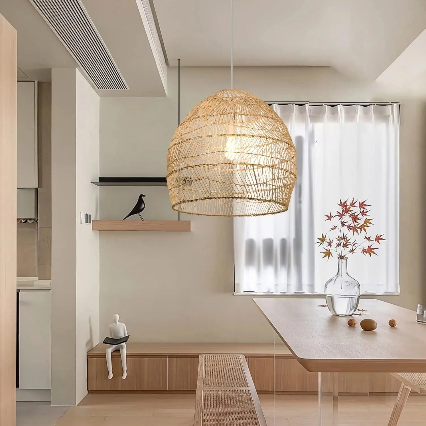 Handwoven wicker hanging lamp. This is the most popular lampshade designed. The wicker hanging lamp is cool. natural. and big! This lamp has a home craft look that is so on trend right now and fits in perfectly with the contemporary Scandinavian interior style. The pendant light is big and makes a statement but it's also light and airy because of the use of natural material. The lamp is organic shaped and not cookie cutter design.